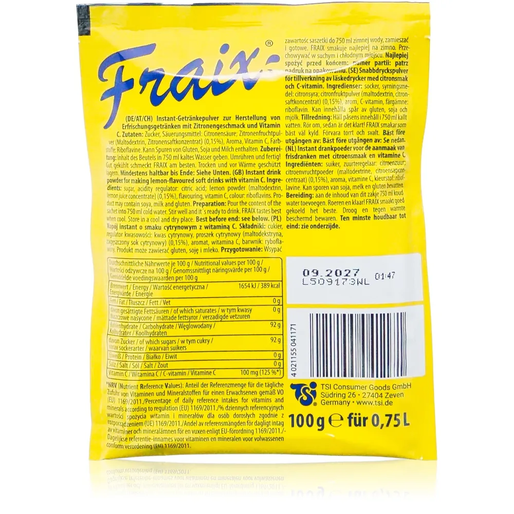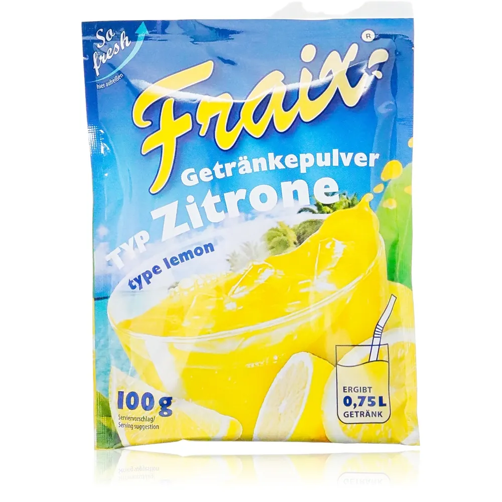 Fraix Getränkepulver überzeugt durch seinen klassischen zitronigen Charakter ohne Kompromisse beim Handling: Ob als einzelne Packung oder im Vorratspaket mit 25 x 100g oder sogar 50 x 100g – Sie entscheiden, wie viele Erlebnisse Sie teilen möchten. Die harmonische Abstimmung von Citronensäure und Vitamin C sorgt für eine ausgewogene Balance zwischen Säure und Frucht – perfekt für alle, die Wert auf einen klaren Geschmack legen.