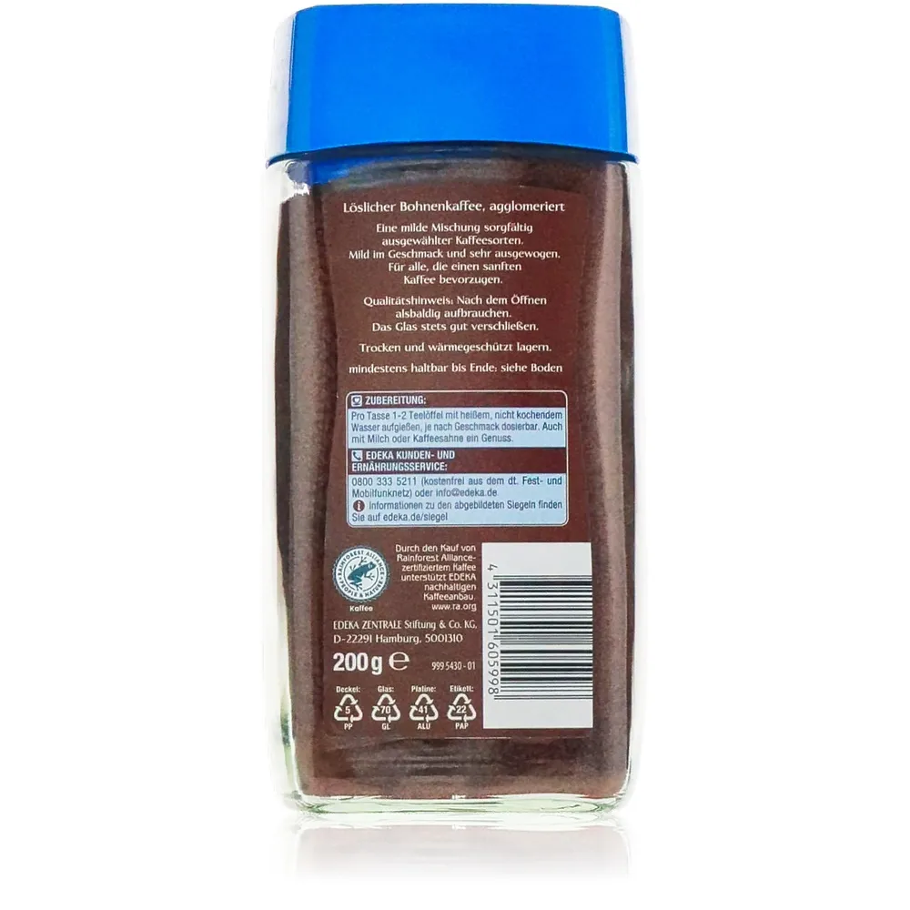 Als Marke des deutschen Handelsunternehmens EDEKA hat sich Gut und Günstig längst als zuverlässiger Partner für bewusste Genießer etabliert. Mit dem Fokus auf Qualität zu fairen Konditionen bietet dieser instant Kaffee eine attraktive Alternative zu klassischen Varianten wie kaffee gemahlen oder koffeinfreier kaffee gemahlen. Dabei überzeugt er nicht nur geschmacklich, sondern auch durch seine unkomplizierte Zubereitung: Einfach heißes Wasser hinzugeben und erleben, wie der gold löslicher Klassiker seinen vollen Charakter entfaltet.
