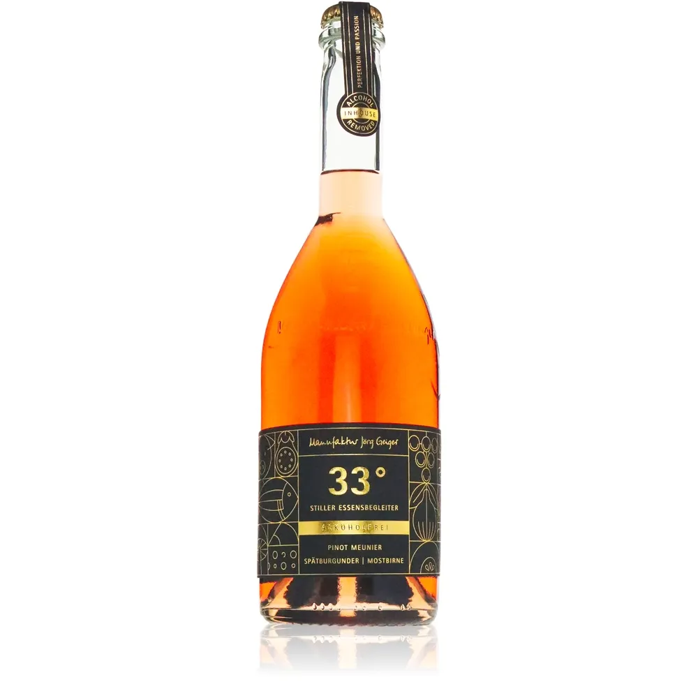Jörg Geigers 33 Grad Pinot Meunier Spätburgunder Mostbirne Alkoholfrei ist mehr als nur ein Getränk – es ist Ausdruck eines neuen Lebensgefühls. Für alle, die das Besondere suchen und Wert auf höchsten Genuss legen. Ein Statement für Individualität im Glas; überraschend vielschichtig, charakterstark und unvergleichlich stilvoll.