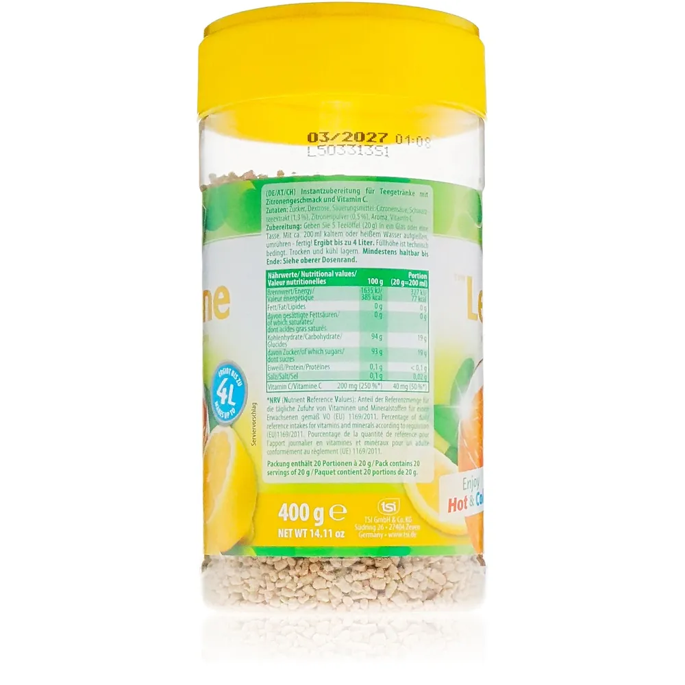 King George bringt Ihnen nicht nur einen erstklassigen Tee-Moment ins Haus, sondern auch die Freiheit kreativer Genussmomente. Probieren Sie das King George Zitronen Instantgetränk 400g doch einmal bei Ihrer nächsten Gartenparty als Basis für spritzige Kreationen aus! Dank der ergiebigen 400g Dose haben Sie stets ausreichend Vorrat für spontane Gäste oder ruhige Stunden allein.
