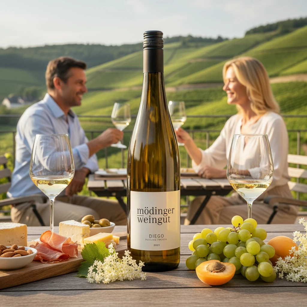Der Mödinger Diego, ein trockener deutscher Riesling, besticht durch frische, abgestimmte Aromen von grünem Apfel, Zitrus und Pfirsich mit leichter Mineralität; ideal für viele Gerichte.