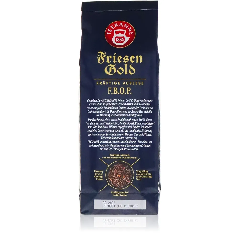 Mit seiner besonderen Komposition aus erlesenen Assam-Tees der Blattsortierung Flowery Broken Orange Pekoe spricht Teekanne Friesengold Kenner wie auch neugierige Entdecker gleichermaßen an. Diese kräftige Auslese begeistert durch ihr intensives Aroma und ihren vollmundigen Geschmack – ein echtes Statement für alle Liebhaber hochwertigen schwarzer Tee-Spezialitäten. Die harmonische Balance zwischen Stärke und feinen Nuancen macht jede Tasse zu einem kleinen Erlebnis.