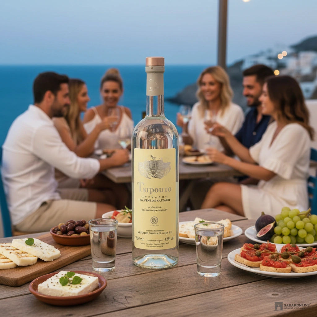 Tsipouro Tirnavou Katsaros kann auf verschiedene Weisen genossen werden. In Griechenland wird er traditionell pur oder mit etwas Wasser serviert, um die Aromen zu entfalten. Er eignet sich hervorragend als Aperitif oder Digestif und wird oft in Gesellschaft und zu besonderen Anlässen getrunken. Die ideale Serviertemperatur liegt bei etwa 18-20 Grad Celsius. Tsipouro passt auch hervorragend zu einer Vielzahl von Speisen, insbesondere zu Meeresfrüchten, Käse und mediterranen Gerichten.